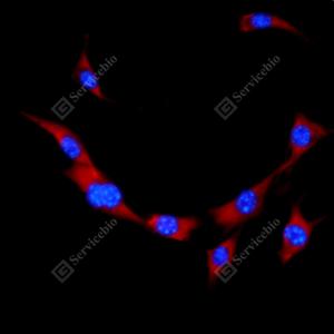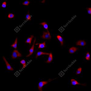 ICC检测RPL10蛋白(货号 GB113267)(红色). 样品: NIH-3T3细胞, 4%多聚甲醛 (货号G1101) 固定20分钟. 封闭: 3% BSA(货号GC305010)的PBS溶液, 室温孵育30分钟. 一抗: 1: 100稀释, 4℃ 孵育过夜. 二抗: Cy3标记山羊抗兔IgG (H+L) (货号GB21303), 1: 300稀释, 室温孵育1小时. |