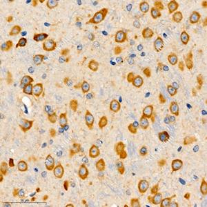 IHC检测RPS3蛋白(货号 GB111238). 样品: 小鼠脑, 4%多聚甲醛 (货号G1101) 固定12-24小时. 抗原修复: 柠檬酸抗原修复液(干粉, pH 6.0) (G1201), 98℃, 20分钟. —抗: 1: 850稀释, 4℃ 孵育过夜. 二抗: HRP标记山羊抗兔IgG (H+L) (货号GB23303), 1: 200稀释, 室温孵育1小时. |