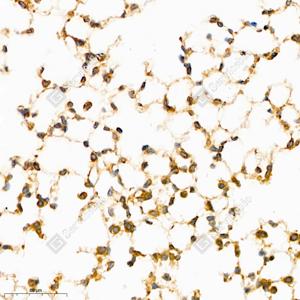 IHC检测RPS3蛋白(货号 GB111238). 样品: 小鼠肺, 4%多聚甲醛 (货号G1101) 固定12-24小时. 抗原修复: 柠檬酸抗原修复液(干粉, pH 6.0) (G1201), 98℃, 20分钟. —抗: 1: 850稀释, 4℃ 孵育过夜. 二抗: HRP标记山羊抗兔IgG (H+L) (货号GB23303), 1: 200稀释, 室温孵育1小时. |