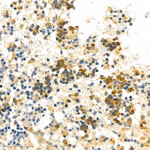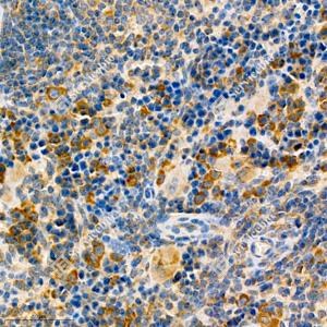 IHC检测RPS3蛋白(货号 GB111238). 样品: 大鼠脾, 4%多聚甲醛 (货号G1101) 固定12-24小时. 抗原修复: 柠檬酸抗原修复液(干粉, pH 6.0) (G1201), 98℃, 20分钟. —抗: 1: 850稀释, 4℃ 孵育过夜. 二抗: HRP标记山羊抗兔IgG (H+L) (货号GB23303), 1: 200稀释, 室温孵育1小时. |
