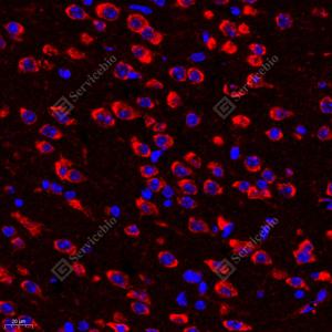 IF检测RPS3蛋白(货号 GB111238)(红色). 样品: 小鼠脑, 4%多聚甲醛 (货号G1101) 固定12-24小时. 抗原修复: Tris-EDTA抗原修复液(pH 9.0) (G1203), 98℃, 20分钟. 封闭: 3% BSA(货号GC305010)的PBS溶液, 室温孵育30分钟. —抗: 1: 1700稀释, 4℃ 孵育过夜. 二抗: Cy3标记山羊抗兔IgG (H+L) (货号GB21303), 1: 300稀释, 室温孵育1小时. |