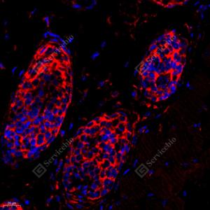 IF检测RPS3蛋白(货号 GB111238)(红色). 样品: 小鼠皮肤, 4%多聚甲醛 (货号G1101) 固定12-24小时. 抗原修复: Tris-EDTA抗原修复液(pH 9.0) (G1203), 98℃, 20分钟. 封闭: 3% BSA(货号GC305010)的PBS溶液, 室温孵育30分钟. —抗: 1: 1700稀释, 4℃ 孵育过夜. 二抗: Cy3标记山羊抗兔IgG (H+L) (货号GB21303), 1: 300稀释, 室温孵育1小时. |