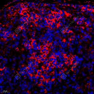 IF检测RPS3蛋白(货号 GB111238)(红色). 样品: 小鼠脾, 4%多聚甲醛 (货号G1101) 固定12-24小时. 抗原修复: Tris-EDTA抗原修复液(pH 9.0) (G1203), 98℃, 20分钟. 封闭: 3% BSA(货号GC305010)的PBS溶液, 室温孵育30分钟. —抗: 1: 1700稀释, 4℃ 孵育过夜. 二抗: Cy3标记山羊抗兔IgG (H+L) (货号GB21303), 1: 300稀释, 室温孵育1小时. |