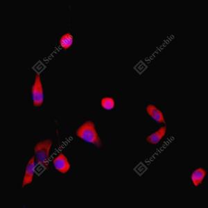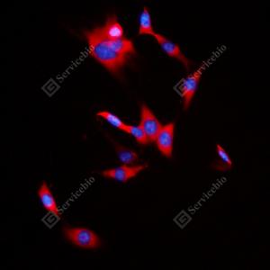 ICC检测RPS3蛋白(货号 GB111238)(红色). 样品: NIH-3T3细胞, 4%多聚甲醛 (货号G1101) 固定20分钟. 封闭: 3% BSA(货号GC305010)的PBS溶液, 室温孵育30分钟. 一抗: 1: 100稀释, 4℃ 孵育过夜. 二抗: Cy3标记山羊抗兔IgG (H+L) (货号GB21303), 1: 300稀释, 室温孵育1小时. |