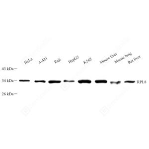 WB检测RPL8蛋白(货号 GB113431). 样品: 经RIPA裂解液(货号G2002)处理的蛋白质. 封闭: 3%脱脂牛奶(货号GC310001)溶于TBST溶液, 室温孵育1小时. —抗: 1: 2000稀释, 4℃ 孵育过夜. 二抗: HRP标记山羊抗兔IgG (H+L) (货号GB23303), 1: 5000稀释, 室温孵育1小时. |