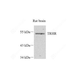 WB检测TRH-R蛋白(货号 GB113007). 样品: 经RIPA裂解液(货号G2002)处理的蛋白质. 封闭: 封闭: 3%脱脂牛奶(货号GC310001)溶于TBST溶液, 室温孵育1小时. —抗: 1: 600稀释, 4℃ 孵育过夜. 二抗: HRP标记山羊抗兔IgG (H+L) (货号GB23303), 1: 5000稀释, 室温孵育1小时. |