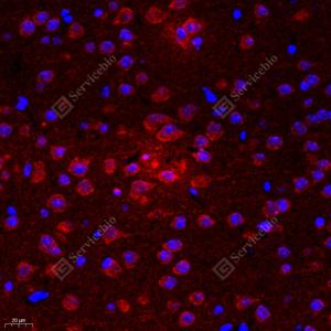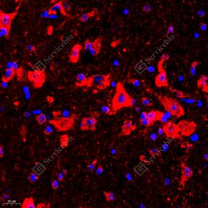 | IF检测Urotensin II蛋白(货号 GB111385)(红色). 样品: 小鼠脑, 4%多聚甲醛 (货号G1101) 固定12-24小时. 抗原修复: Tris-EDTA抗原修复液(pH 9.0) (G1203), 98℃, 20分钟. 封闭: 3% BSA(货号GC305010)的PBS溶液, 室温孵育30分钟. —抗: 1: 2000稀释, 4℃ 孵育过夜. 二抗: Cy3标记山羊抗兔IgG (H+L) (货号GB21303), 1: 300稀释, 室温孵育1小时. |
