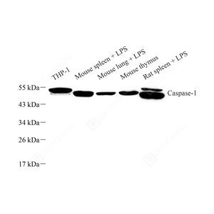 WB检测Caspase-1蛋白(货号 GB11383). 样品: 经RIPA裂解液(货号G2002)处理的蛋白质. 封闭: 3%脱脂牛奶(货号GC310001)溶于TBST溶液, 室温孵育1小时. —抗: 1: 1000稀释, 4℃ 孵育过夜. 二抗: HRP标记山羊抗兔IgG (H+L) (货号GB23303), 1: 5000稀释, 室温孵育1小时. |