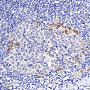 IHC检测Caspase-1蛋白(货号 GB11383). 样品: 人扁桃体, 4%多聚甲醛 (货号G1101) 固定12-24小时. 抗原修复: 柠檬酸抗原修复液(干粉, pH 6.0) (G1201), 高压锅均匀喷气计时2分钟. —抗: 1: 600稀释, 4℃ 孵育过夜. 二抗: HRP标记山羊抗兔IgG (H+L) (货号GB23303), 1: 200稀释, 室温孵育1小时. |