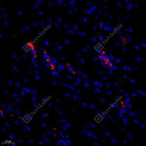 IF检测Caspase-1蛋白(货号 GB11383)(红色). 样品: 人胃, 4%多聚甲醛 (货号G1101) 固定12-24小时. 抗原修复: 柠檬酸抗原修复液(干粉, pH 6.0) (G1201), 高压锅均匀喷气计时2分钟. 封闭: 3% BSA(货号GC305010)的PBS溶液, 室温孵育30分钟. —抗: 1: 600稀释, 4℃ 孵育过夜. 二抗: Cy3标记山羊抗兔IgG (H+L) (货号GB21303), 1: 300稀释, 室温孵育1小时. |