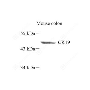 WB检测Cytokeratin 19蛋白(货号 GB122161). 样品: 经RIPA裂解液(货号G2002)处理的蛋白质. 封闭: 封闭: 3%脱脂牛奶(货号GC310001)溶于TBST溶液, 室温孵育1小时. —抗: 1: 1000稀释, 4℃ 孵育过夜. 二抗: HRP标记山羊抗小鼠IgG (H+L) (货号GB23301), 1: 5000稀释, 室温孵育1小时. |