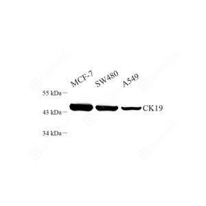 WB检测Cytokeratin 19蛋白(货号 GB112161). 样品: 经RIPA裂解液(货号G2002)处理的蛋白质. 封闭: 3%脱脂牛奶(货号GC310001)溶于TBST溶液, 室温孵育1小时. —抗: 1: 500稀释, 4℃ 孵育过夜. 二抗: HRP标记山羊抗兔IgG (H+L) (货号GB23303), 1: 5000稀释, 室温孵育1小时. |