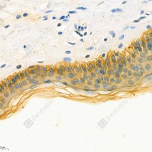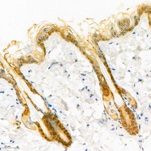 IHC检测Cytokeratin 19蛋白(货号 GB112161). 样品: 小鼠皮肤, 4%多聚甲醛 (货号G1101) 固定12-24小时. 抗原修复: 柠檬酸抗原修复液(干粉, pH 6.0) (G1201), 98℃, 20分钟. —抗: 1: 1500稀释, 4℃ 孵育过夜. 二抗: HRP标记山羊抗兔IgG (H+L) (货号GB23303), 1: 200稀释, 室温孵育1小时. |