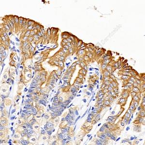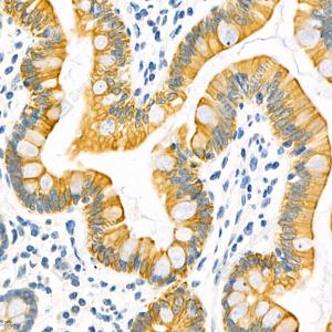 IHC检测Cytokeratin 19蛋白(货号 GB112161). 样品: 人小肠, 4%多聚甲醛 (货号G1101) 固定12-24小时. 抗原修复: 柠檬酸抗原修复液(干粉, pH 6.0) (G1201), 98℃, 20分钟. —抗: 1: 1500稀释, 4℃ 孵育过夜. 二抗: HRP标记山羊抗兔IgG (H+L) (货号GB23303), 1: 200稀释, 室温孵育1小时. |