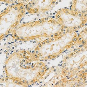 IHC检测Cytokeratin 19蛋白(货号 GB112161). 样品: 大鼠肾, 4%多聚甲醛 (货号G1101) 固定12-24小时. 抗原修复: 柠檬酸抗原修复液(干粉, pH 6.0) (G1201), 98℃, 20分钟. —抗: 1: 1500稀释, 4℃ 孵育过夜. 二抗: HRP标记山羊抗兔IgG (H+L) (货号GB23303), 1: 200稀释, 室温孵育1小时. |