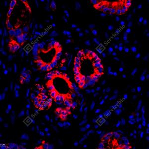 IF检测Cytokeratin 19蛋白(货号 GB112161)(红色). 样品: 人胆管癌, 4%多聚甲醛 (货号G1101) 固定12-24小时. 抗原修复: Tris-EDTA抗原修复液(pH 9.0) (G1203), 98℃, 20分钟. 封闭: 3% BSA(货号GC305010)的PBS溶液, 室温孵育30分钟. —抗: 1: 500稀释, 4℃ 孵育过夜. 二抗: Cy3标记山羊抗兔IgG (H+L) (货号GB21303), 1: 300稀释, 室温孵育1小时. |