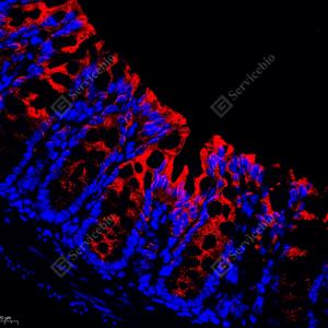 IF检测Cytokeratin 19蛋白(货号 GB112161)(红色). 样品: 小鼠结肠, 4%多聚甲醛 (货号G1101) 固定12-24小时. 抗原修复: Tris-EDTA抗原修复液(pH 9.0) (G1203), 98℃, 20分钟. 封闭: 3% BSA(货号GC305010)的PBS溶液, 室温孵育30分钟. —抗: 1: 500稀释, 4℃ 孵育过夜. 二抗: Cy3标记山羊抗兔IgG (H+L) (货号GB21303), 1: 300稀释, 室温孵育1小时. |