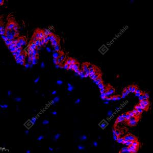 IF检测Cytokeratin 19蛋白(货号 GB112161)(红色). 样品: 小鼠皮肤, 4%多聚甲醛 (货号G1101) 固定12-24小时. 抗原修复: Tris-EDTA抗原修复液(pH 9.0) (G1203), 98℃, 20分钟. 封闭: 3% BSA(货号GC305010)的PBS溶液, 室温孵育30分钟. —抗: 1: 500稀释, 4℃ 孵育过夜. 二抗: Cy3标记山羊抗兔IgG (H+L) (货号GB21303), 1: 300稀释, 室温孵育1小时. |