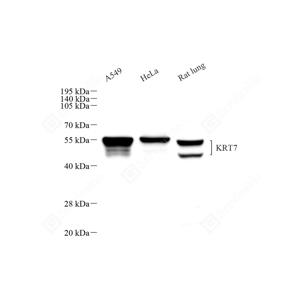 WB检测Cytokeratin 7蛋白(货号 GB115695). 样品: 经RIPA裂解液(货号G2002)处理的蛋白质. 封闭: 3%脱脂牛奶(货号GC310001)溶于TBST溶液, 室温孵育1小时. —抗: 1: 500稀释, 4℃ 孵育过夜. 二抗: HRP标记山羊抗兔IgG (H+L) (货号GB23303), 1: 5000稀释, 室温孵育1小时. |