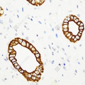 IHC检测Cytokeratin 7蛋白(货号 GB115695). 样品: 人肾, 4%多聚甲醛 (货号G1101) 固定12-24小时. 抗原修复: 柠檬酸抗原修复液(干粉, pH 6.0) (G1201), 98℃, 20分钟. —抗: 1: 1000稀释, 4℃ 孵育过夜. 二抗: HRP标记山羊抗兔IgG (H+L) (货号GB23303), 1: 200稀释, 室温孵育1小时. |