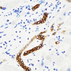 IHC检测Cytokeratin 7蛋白(货号 GB115695). 样品: 人肝, 4%多聚甲醛 (货号G1101) 固定12-24小时. 抗原修复: 柠檬酸抗原修复液(干粉, pH 6.0) (G1201), 98℃, 20分钟. —抗: 1: 1000稀释, 4℃ 孵育过夜. 二抗: HRP标记山羊抗兔IgG (H+L) (货号GB23303), 1: 200稀释, 室温孵育1小时. |