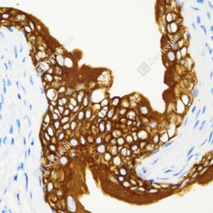 IHC检测Cytokeratin 7蛋白(货号 GB115695). 样品: 大鼠膀胱, 4%多聚甲醛 (货号G1101) 固定12-24小时. 抗原修复: 柠檬酸抗原修复液(干粉, pH 6.0) (G1201), 98℃, 20分钟. —抗: 1: 1000稀释, 4℃ 孵育过夜. 二抗: HRP标记山羊抗兔IgG (H+L) (货号GB23303), 1: 200稀释, 室温孵育1小时. |