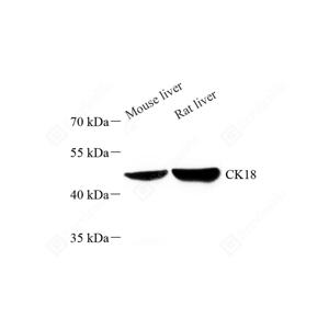 WB检测Cytokeratin 18蛋白(货号 GB12232). 样品: 经RIPA裂解液(货号G2002)处理的蛋白质. 封闭: 3%脱脂牛奶(货号GC310001)溶于TBST溶液, 室温孵育1小时. —抗: 1: 2000稀释, 4℃ 孵育过夜. 二抗: HRP标记山羊抗小鼠IgG (H+L) (货号GB23301), 1: 5000稀释, 室温孵育1小时. |