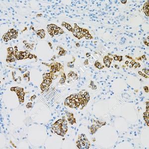 IHC检测Cytokeratin 18蛋白(货号 GB12232). 样品: 人乳腺癌, 4%多聚甲醛 (货号G1101) 固定12-24小时. 抗原修复: 柠檬酸抗原修复液(干粉, pH 6.0) (G1201), 高压锅均匀喷气计时2分钟. —抗: 1: 1000稀释, 4℃ 孵育过夜. 二抗: HRP标记山羊抗小鼠IgG (H+L) (货号GB23301), 1: 200稀释, 室温孵育1小时. |