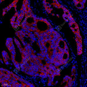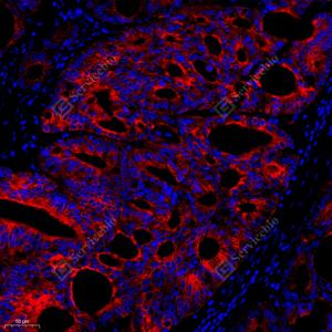 IF检测Cytokeratin 18蛋白(货号 GB12232)(红色). 样品: 人结肠癌, 4%多聚甲醛 (货号G1101) 固定12-24小时. 抗原修复: 柠檬酸抗原修复液(干粉, pH 6.0) (G1201), 高压锅均匀喷气计时2分钟. 封闭: 3% BSA(货号GC305010)的PBS溶液, 室温孵育30分钟. —抗: 1: 500稀释, 4℃ 孵育过夜. 二抗: Cy3标记山羊抗小鼠IgG (H+L) (货号GB21301), 1: 300稀释, 室温孵育1小时. |