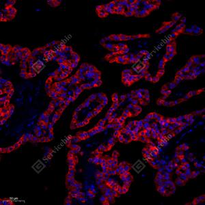 IF检测Cytokeratin 18蛋白(货号 GB12232)(红色). 样品: 人胎盘, 4%多聚甲醛 (货号G1101) 固定12-24小时. 抗原修复: 柠檬酸抗原修复液(干粉, pH 6.0) (G1201), 高压锅均匀喷气计时2分钟. 封闭: 3% BSA(货号GC305010)的PBS溶液, 室温孵育30分钟. —抗: 1: 500稀释, 4℃ 孵育过夜. 二抗: Cy3标记山羊抗小鼠IgG (H+L) (货号GB21301), 1: 300稀释, 室温孵育1小时. |