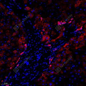 IF检测Cytokeratin 18蛋白(货号 GB12232)(红色). 样品: 人肺腺癌, 4%多聚甲醛 (货号G1101) 固定12-24小时. 抗原修复: 柠檬酸抗原修复液(干粉, pH 6.0) (G1201), 高压锅均匀喷气计时2分钟. 封闭: 3% BSA(货号GC305010)的PBS溶液, 室温孵育30分钟. —抗: 1: 500稀释, 4℃ 孵育过夜. 二抗: Cy3标记山羊抗小鼠IgG (H+L) (货号GB21301), 1: 300稀释, 室温孵育1小时. |
