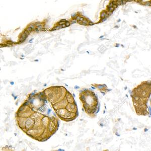 | IHC检测Cytokeratin 14蛋白(货号 GB11803). 样品: 小鼠皮肤, 4%多聚甲醛 (货号G1101) 固定12-24小时. 抗原修复: 柠檬酸抗原修复液(干粉, pH 6.0) (G1201), 98℃, 20分钟. —抗: 1: 1500稀释, 4℃ 孵育过夜. 二抗: HRP标记山羊抗兔IgG (H+L) (货号GB23303), 1: 200稀释, 室温孵育1小时. |