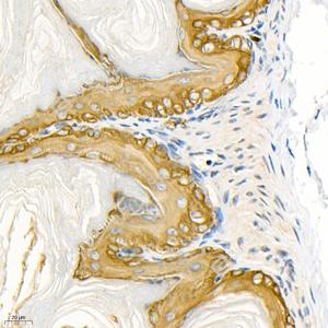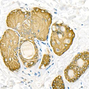 | IHC检测Cytokeratin 14蛋白(货号 GB11803). 样品: 大鼠皮肤, 4%多聚甲醛 (货号G1101) 固定12-24小时. 抗原修复: 柠檬酸抗原修复液(干粉, pH 6.0) (G1201), 98℃, 20分钟. —抗: 1: 1500稀释, 4℃ 孵育过夜. 二抗: HRP标记山羊抗兔IgG (H+L) (货号GB23303), 1: 200稀释, 室温孵育1小时. |