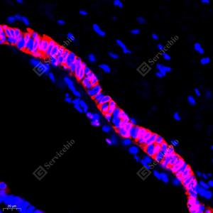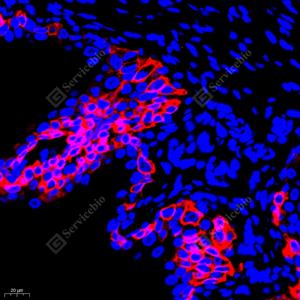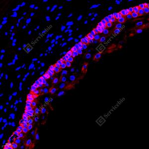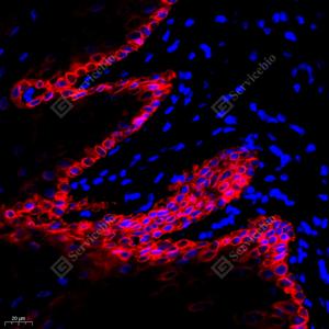 | IF检测Cytokeratin 14蛋白(货号 GB11803)(红色). 样品: 大鼠膀胱, 4%多聚甲醛 (货号G1101) 固定12-24小时. 抗原修复: Tris-EDTA抗原修复液(pH 9.0) (G1203), 98℃, 20分钟. 封闭: 3% BSA(货号GC305010)的PBS溶液, 室温孵育30分钟. —抗: 1: 500稀释, 4℃ 孵育过夜. 二抗: Cy3标记山羊抗兔IgG (H+L) (货号GB21303), 1: 300稀释, 室温孵育1小时. |