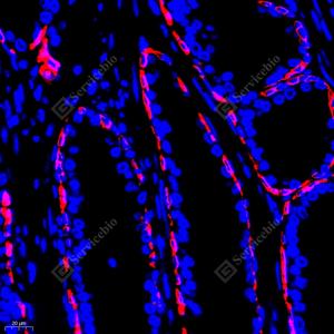| IF检测Cytokeratin 14蛋白(货号 GB11803)(红色). 样品: 人前列腺, 4%多聚甲醛 (货号G1101) 固定12-24小时. 抗原修复: Tris-EDTA抗原修复液(pH 9.0) (G1203), 98℃, 20分钟. 封闭: 3% BSA(货号GC305010)的PBS溶液, 室温孵育30分钟. —抗: 1: 500稀释, 4℃ 孵育过夜. 二抗: Cy3标记山羊抗兔IgG (H+L) (货号GB21303), 1: 300稀释, 室温孵育1小时. |