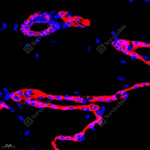 | IF检测Cytokeratin 14蛋白(货号 GB11803)(红色). 样品: 小鼠皮肤, 4%多聚甲醛 (货号G1101) 固定12-24小时. 抗原修复: Tris-EDTA抗原修复液(pH 9.0) (G1203), 98℃, 20分钟. 封闭: 3% BSA(货号GC305010)的PBS溶液, 室温孵育30分钟. —抗: 1: 500稀释, 4℃ 孵育过夜. 二抗: Cy3标记山羊抗兔IgG (H+L) (货号GB21303), 1: 300稀释, 室温孵育1小时. |