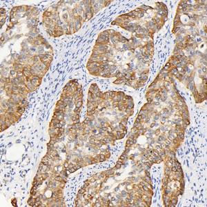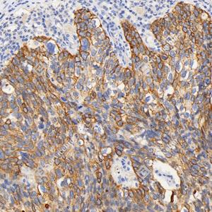| IHC检测Cytokeratin 5蛋白(货号 GB121246). 样品: 人宫颈癌, 4%多聚甲醛 (货号G1101) 固定12-24小时. 抗原修复: 柠檬酸抗原修复液(干粉, pH 6.0) (G1201), 高压锅均匀喷气计时2分钟. —抗: 1: 400稀释, 4℃ 孵育过夜. 二抗: HRP标记山羊抗小鼠IgG (H+L) (货号GB23301), 1: 200稀释, 室温孵育1小时. |