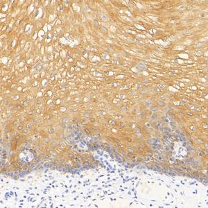 | IHC检测Cytokeratin 5蛋白(货号 GB121246). 样品: 人食管, 4%多聚甲醛 (货号G1101) 固定12-24小时. 抗原修复: 柠檬酸抗原修复液(干粉, pH 6.0) (G1201), 高压锅均匀喷气计时2分钟. —抗: 1: 800稀释, 4℃ 孵育过夜. 二抗: HRP标记山羊抗小鼠IgG (H+L) (货号GB23301), 1: 200稀释, 室温孵育1小时. |