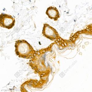 | IHC检测Cytokeratin 5蛋白(货号 GB111246). 样品: 小鼠皮肤, 4%多聚甲醛 (货号G1101) 固定12-24小时. 抗原修复: 柠檬酸抗原修复液(干粉, pH 6.0) (G1201), 98℃, 20分钟. —抗: 1: 1000稀释, 4℃ 孵育过夜. 二抗: HRP标记山羊抗兔IgG (H+L) (货号GB23303), 1: 200稀释, 室温孵育1小时. |
