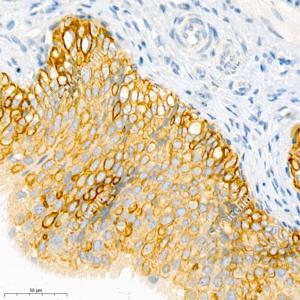| IHC检测Cytokeratin 5蛋白(货号 GB111246). 样品: 大鼠膀胱, 4%多聚甲醛 (货号G1101) 固定12-24小时. 抗原修复: 柠檬酸抗原修复液(干粉, pH 6.0) (G1201), 98℃, 20分钟. —抗: 1: 1000稀释, 4℃ 孵育过夜. 二抗: HRP标记山羊抗兔IgG (H+L) (货号GB23303), 1: 200稀释, 室温孵育1小时. |