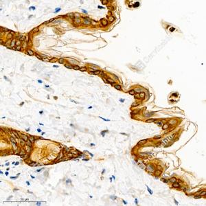 | IHC检测Cytokeratin 5蛋白(货号 GB111246). 样品: 大鼠皮肤, 4%多聚甲醛 (货号G1101) 固定12-24小时. 抗原修复: 柠檬酸抗原修复液(干粉, pH 6.0) (G1201), 98℃, 20分钟. —抗: 1: 1000稀释, 4℃ 孵育过夜. 二抗: HRP标记山羊抗兔IgG (H+L) (货号GB23303), 1: 200稀释, 室温孵育1小时. |