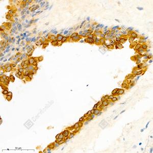 | IHC检测Cytokeratin 5蛋白(货号 GB111246). 样品: 人乳腺癌, 4%多聚甲醛 (货号G1101) 固定12-24小时. 抗原修复: 柠檬酸抗原修复液(干粉, pH 6.0) (G1201), 98℃, 20分钟. —抗: 1: 1000稀释, 4℃ 孵育过夜. 二抗: HRP标记山羊抗兔IgG (H+L) (货号GB23303), 1: 200稀释, 室温孵育1小时. |