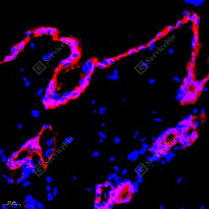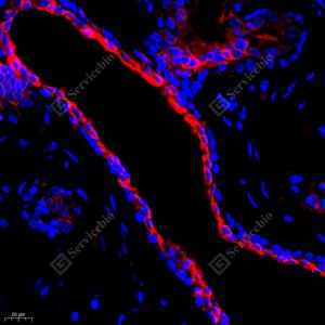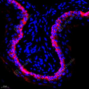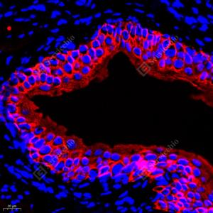 | IF检测Cytokeratin 5蛋白(货号 GB111246)(红色). 样品: 大鼠膀胱, 4%多聚甲醛 (货号G1101) 固定12-24小时. 抗原修复: Tris-EDTA抗原修复液(pH 9.0) (G1203), 98℃, 20分钟. 封闭: 3% BSA(货号GC305010)的PBS溶液, 室温孵育30分钟. —抗: 1: 2000稀释, 4℃ 孵育过夜. 二抗: Cy3标记山羊抗兔IgG (H+L) (货号GB21303), 1: 300稀释, 室温孵育1小时. |
