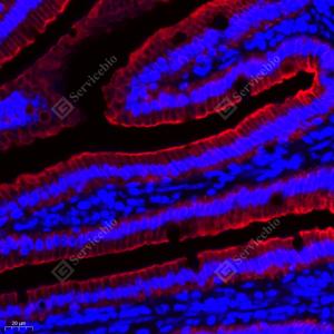 IF检测Cytokeratin 8蛋白(货号 GB11231)(红色). 样品: 小鼠小肠, 4%多聚甲醛 (货号G1101) 固定12-24小时. 抗原修复: Tris-EDTA抗原修复液(pH 9.0) (G1203), 98℃, 20分钟. 封闭: 3% BSA(货号GC305010)的PBS溶液, 室温孵育30分钟. —抗: 1: 200稀释, 4℃ 孵育过夜. 二抗: Cy3标记山羊抗兔IgG (H+L) (货号GB21303), 1: 300稀释, 室温孵育1小时. |