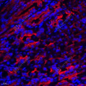 IF检测Cytokeratin 8蛋白(货号 GB11231)(红色). 样品: 人胃, 4%多聚甲醛 (货号G1101) 固定12-24小时. 抗原修复: Tris-EDTA抗原修复液(pH 9.0) (G1203), 98℃, 20分钟. 封闭: 3% BSA(货号GC305010)的PBS溶液, 室温孵育30分钟. —抗: 1: 200稀释, 4℃ 孵育过夜. 二抗: Cy3标记山羊抗兔IgG (H+L) (货号GB21303), 1: 300稀释, 室温孵育1小时. |