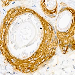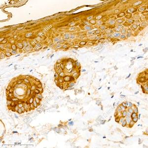 IHC检测Cytokeratin 6蛋白(货号 GB12800). 样品: 大鼠皮肤, 4%多聚甲醛 (货号G1101) 固定12-24小时. 抗原修复: 柠檬酸抗原修复液(干粉, pH 6.0) (G1201), 高压锅均匀喷气计时2分钟. —抗: 1: 1000稀释, 4℃ 孵育过夜. 二抗: HRP标记山羊抗小鼠IgG (H+L) (货号GB23301), 1: 200稀释, 室温孵育1小时. |