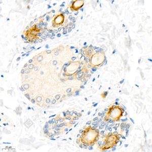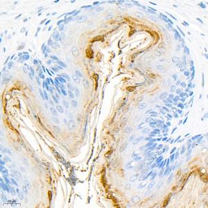 IHC检测Cytokeratin 6蛋白(货号 GB11800). 样品: 小鼠皮肤, 4%多聚甲醛 (货号G1101) 固定12-24小时. 抗原修复: 柠檬酸抗原修复液(干粉, pH 6.0) (G1201), 98℃, 20分钟. —抗: 1: 1500稀释, 4℃ 孵育过夜. 二抗: HRP标记山羊抗兔IgG (H+L) (货号GB23303), 1: 200稀释, 室温孵育1小时. |