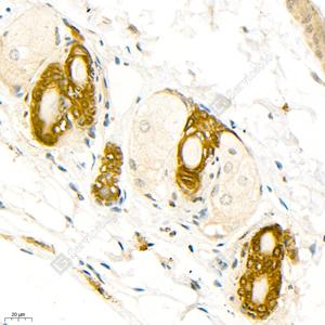 IHC检测Cytokeratin 6蛋白(货号 GB11823). 样品: 大鼠皮肤, 4%多聚甲醛 (货号G1101) 固定12-24小时. 抗原修复: 柠檬酸抗原修复液(干粉, pH 6.0) (G1201), 98℃, 20分钟. —抗: 1: 2000稀释, 4℃ 孵育过夜. 二抗: HRP标记山羊抗兔IgG (H+L) (货号GB23303), 1: 200稀释, 室温孵育1小时. |