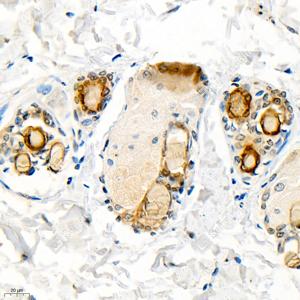 IHC检测Cytokeratin 6蛋白(货号 GB11823). 样品: 小鼠皮肤, 4%多聚甲醛 (货号G1101) 固定12-24小时. 抗原修复: 柠檬酸抗原修复液(干粉, pH 6.0) (G1201), 98℃, 20分钟. —抗: 1: 2000稀释, 4℃ 孵育过夜. 二抗: HRP标记山羊抗兔IgG (H+L) (货号GB23303), 1: 200稀释, 室温孵育1小时. |