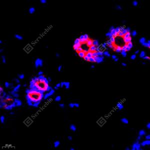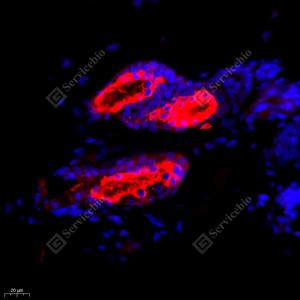 IF检测Cytokeratin 6蛋白(货号 GB11823)(红色). 样品: 大鼠皮肤, 4%多聚甲醛 (货号G1101) 固定12-24小时. 抗原修复: Tris-EDTA抗原修复液(pH 9.0) (G1203), 98℃, 20分钟. 封闭: 3% BSA(货号GC305010)的PBS溶液, 室温孵育30分钟. —抗: 1: 1000稀释, 4℃ 孵育过夜. 二抗: Cy3标记山羊抗兔IgG (H+L) (货号GB21303), 1: 300稀释, 室温孵育1小时. |